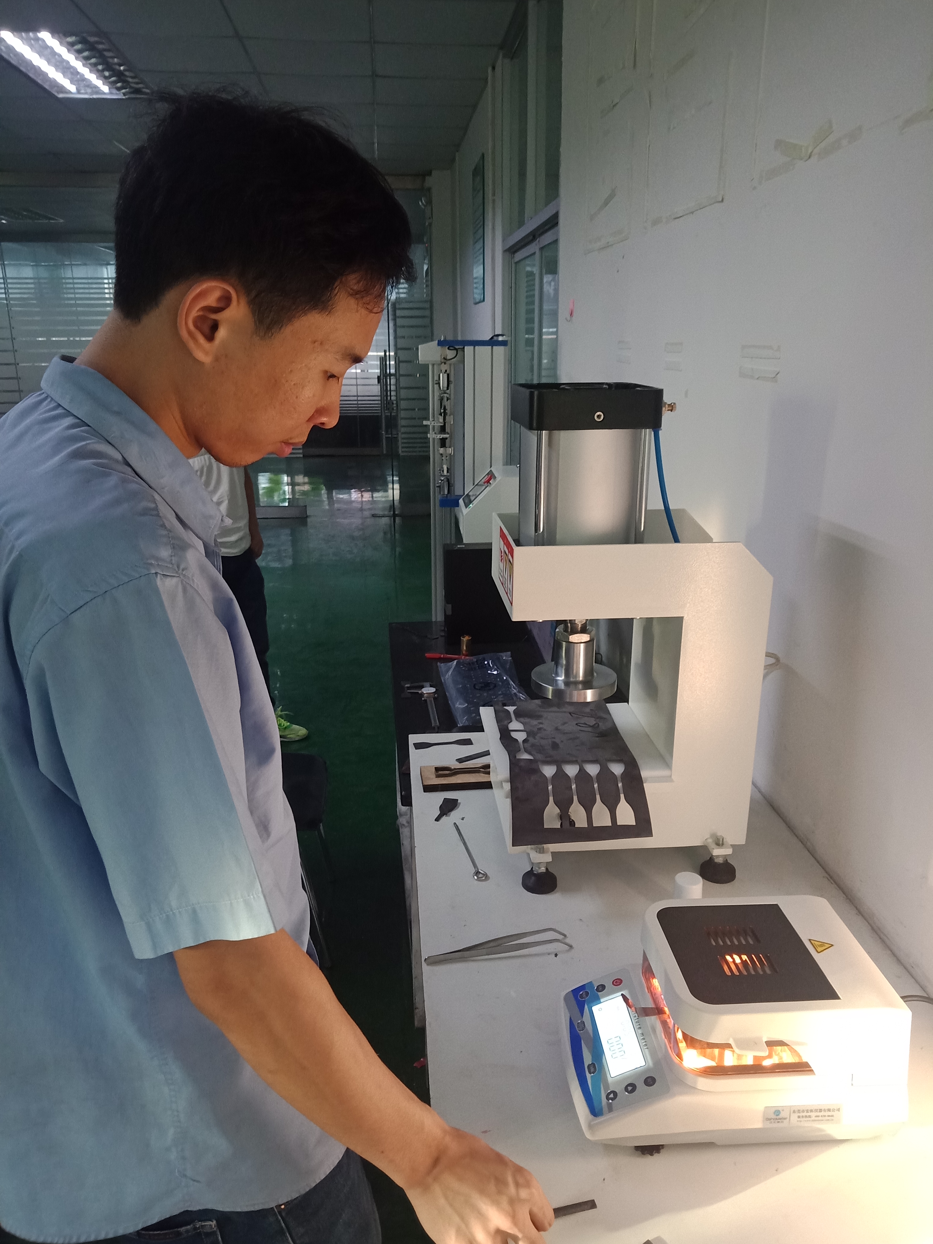 10月底,福磁電子的嚴(yán)經(jīng)理等人帶樣品上門測(cè)試,分別測(cè)試了橡膠的拉伸強(qiáng)度和密度等數(shù)據(jù),客戶表示對(duì)我們儀器和測(cè)試數(shù)據(jù)很滿意,當(dāng)天還了解了切片機(jī)與水分儀,經(jīng)過(guò)雙方的溝通,最終確認(rèn)采購(gòu)這四款儀器;簽訂合同兩天后安排送貨。